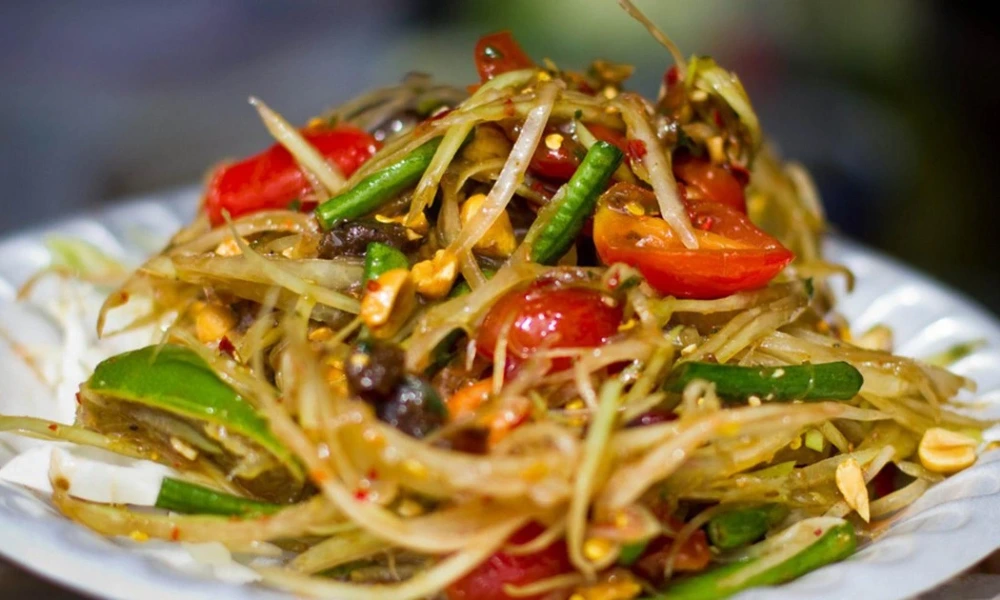 El Tam Mak Hoong es la ensalada de papaya más emblemática y representa el alma de la comida Laos. A diferencia del Som Tum de Tailandia, esta versión utiliza Padaek, un tipo de pasta de pescado que aporta un sabor más rico e intenso. Es una combinación perfecta de papaya crujiente, chiles intensos y un toque cítrico que cautiva desde el primer bocado.