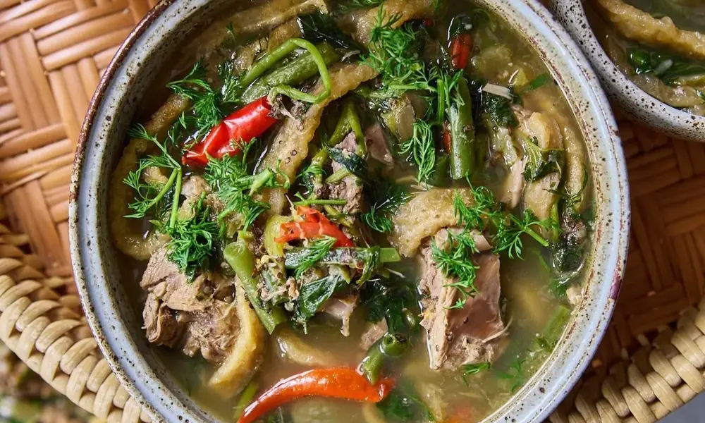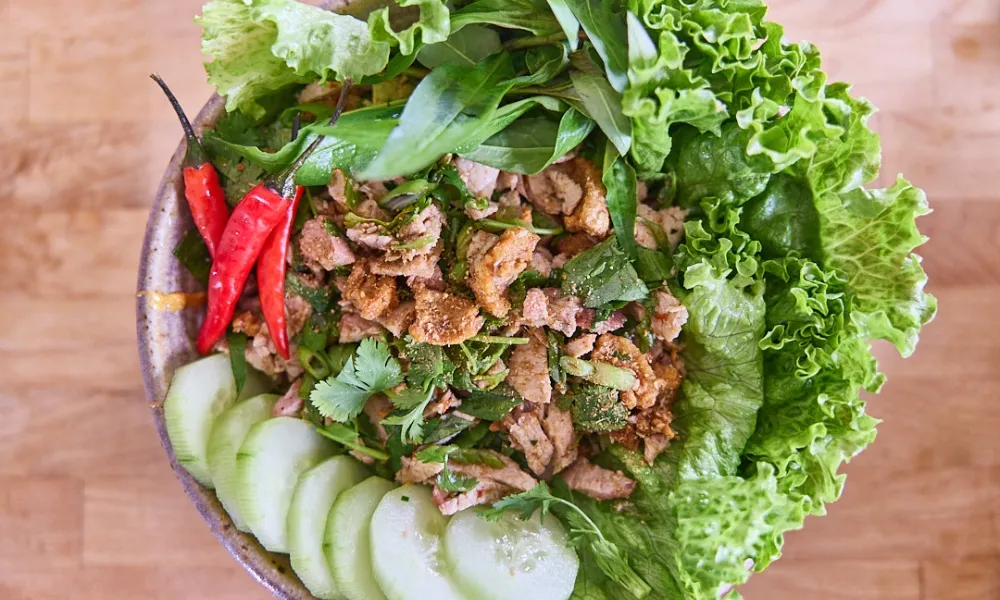 Luego, la carne se mezcla con hierbas frescas. Este plato se considera un símbolo de buena suerte y a menudo se comparte en reuniones familiares o festividades en Laos. Esta joya culinaria representa la esencia de la comida de Laos, donde la frescura y el simbolismo se unen en cada bocado.