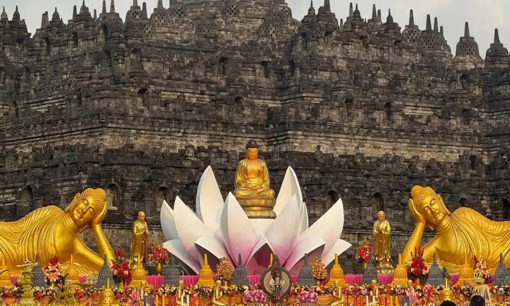 La procesión principal suele comenzar en el monasterio de Mendut, pasa por el monasterio de Pawon y concluye en Borobudur. Durante la procesión, los fieles llevan flores, farolillos y textos sagrados. Camina y recita plegarias en un ambiente solemne pero también cálido y cercano.
