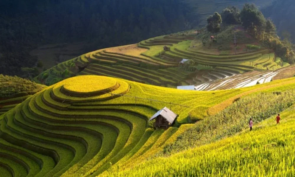 Escondido entre las montañas y bosques del noroeste, Mu Cang Chai se ha convertido desde hace tiempo en un destino soñado a Vietnam. Desde lo alto, las terrazas de arroz en cada estación crean un cuadro vivo en medio de la inmensidad. Entre ellas se dibujan aldeas tranquilas y sencillas.