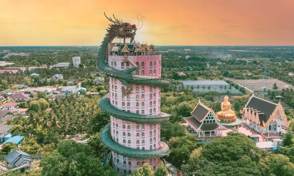 Wat Samphran, conocido como el Templo del Dragón Tailandia, se encuentra en Nakhon Pathom, cerca de Bangkok. Su característica más llamativa es el enorme dragón rosa que se enrosca alrededor de la torre de 17 pisos, creando una imagen única y sorprendente. Los visitantes pueden subir por el interior del dragón y disfrutar de vistas panorámicas del entorno, convirtiendo la visita en una experiencia inolvidable.
