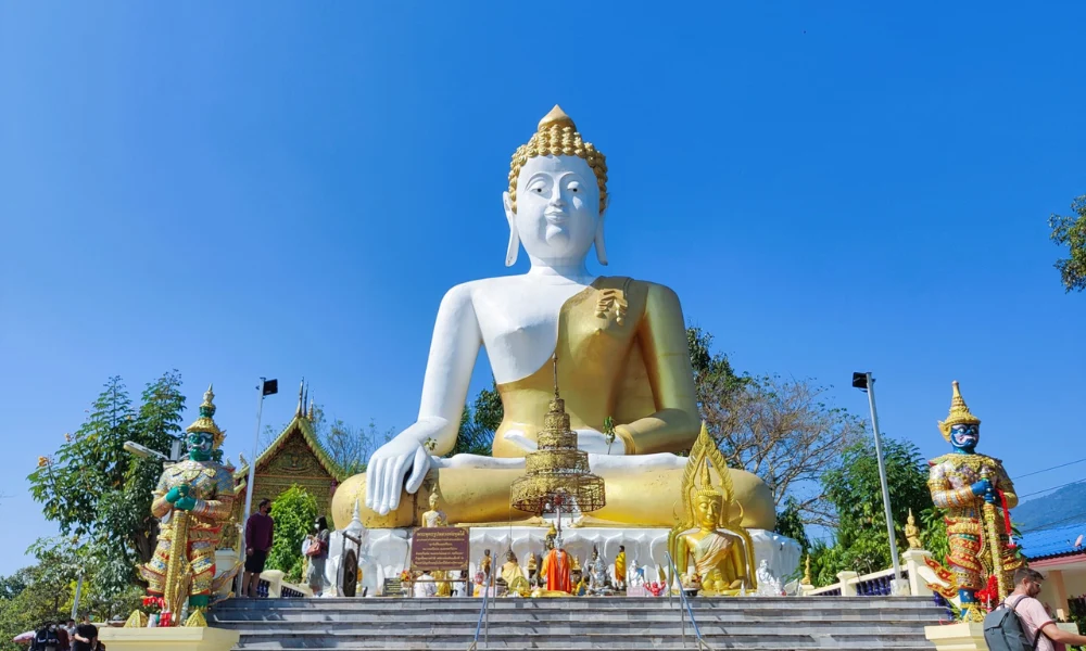 En el interior del templo, una gigantesca estatua blanca de Buda meditando en medio de un espacio azul crea un contraste impresionante. Los coloridos murales narran historias budistas, lo que convierte a este lugar en un destino popular para muchos visitantes. El templo está abierto al público de forma gratuita, lo que facilita su visita y culto.