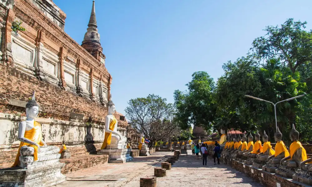 El Wat Yai Chai Mongkol destaca por su gran estupa y las hileras de estatuas de Buda que rodean el complejo. Fundado en 1357, aún mantiene un fuerte valor espiritual y cultural. Este lugar ofrece una visión auténtica de Ayutthaya, diferente a lo que suelen mostrar los Bangkok templos.